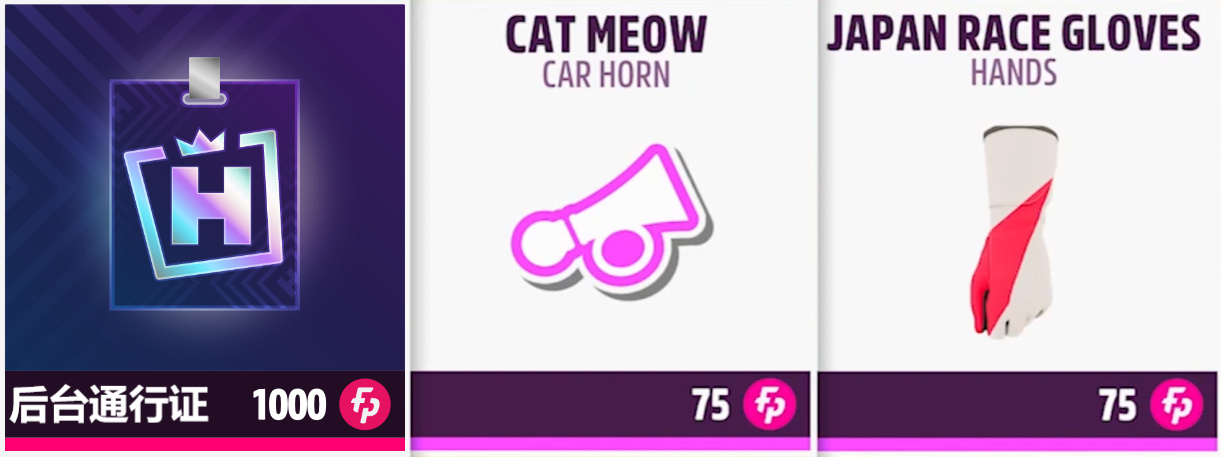 其余物品:后台通行证、猫叫声、日本赛车手套