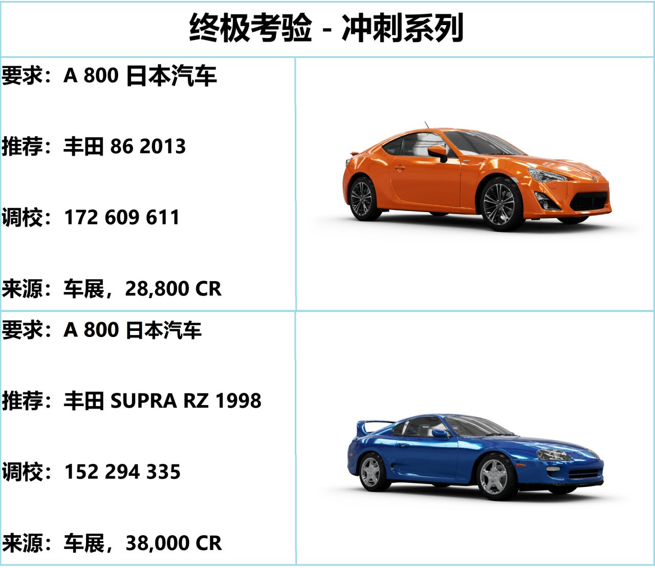 三场冲刺完美贴合主题,日系车型太多,随便挑出两辆供大伙使用。86 的稳定性、操控性都很不错,略缺后半段的表现,适合新人练手;Supra RZ 的马力稍微大一点,可控性则有所下滑,看个人习惯挑吧(嫌慢的可以开大后去...