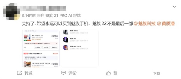 受此消息影响,一位资深魅友果断下单了一台魅族22 16GB+512GB版本,花费3293.09元。他表示,希望永远可以买到魅族手机,魅族22不是最后一部。