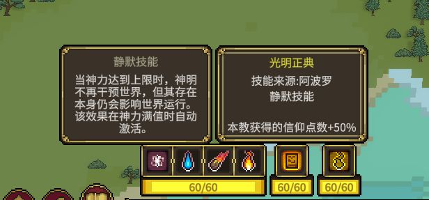 每当信仰达到一个阶段时,你将获得一次从三位神明中选择一项技能的机会;同时,在科技树上也会为人类解锁新的科技天赋。