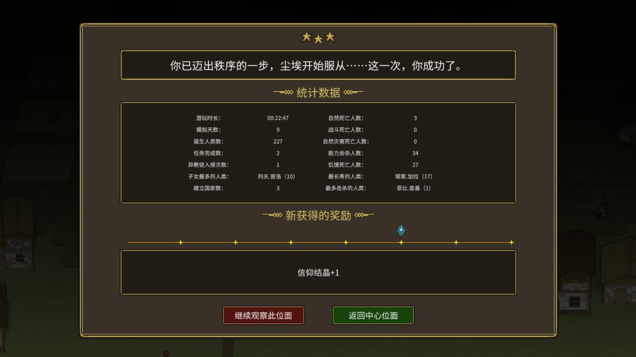 当国家和信仰体系基本完善后,游戏会自动结束并进行统计结算。