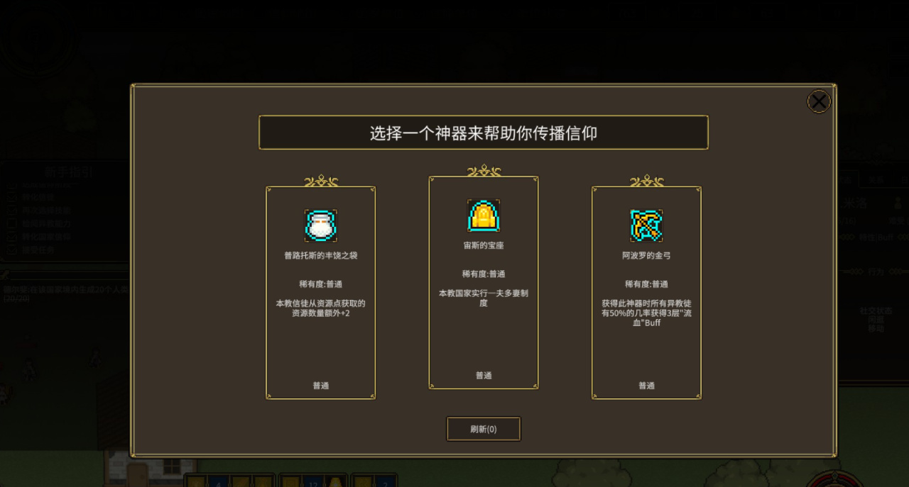 刚刚开局可以从神明的随机主动技能中三选一。由于我携带的「宙斯」主要用于繁殖人口,而「阿波罗」则掌管凡人生死,负责给人施加负面状态或恢复生命。
