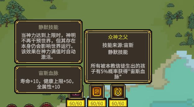 其次,神明在开局时也拥有被动的初始技能。例如这局我携带的「宙斯」及「阿波罗」:宙斯的初始被动技能【众神之父】则如果是本信徒所繁育的孩子,则有5%概率出生自带宙斯血脉;