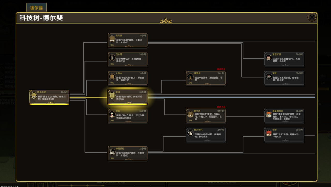 初始的“简易工坊”分支可以解锁麦田、人造木、民兵营、贸易、神明祭坛等科技。其中麦田分支还能衍生出“灌溉术”和“面包工坊”这两个与食物相关的天赋。