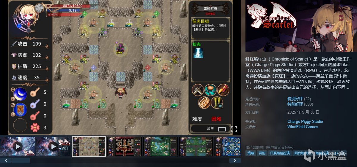 绯红编年史( Chronicle of Scarlet )是一款由冲小猪工作室( Charge Piggy Studio )东方Project同人的魔塔Like(WWA Like)的角色扮演游戏(RPG)。在游戏中,您需要扮演血族【真红】一族的次女——芙兰朵露·斯卡雷特,在奇幻的世界里激活自己的天赋、构筑装备、消灭敌人,并随着故事的进展做出自己的选择,从而走向不同的结局。