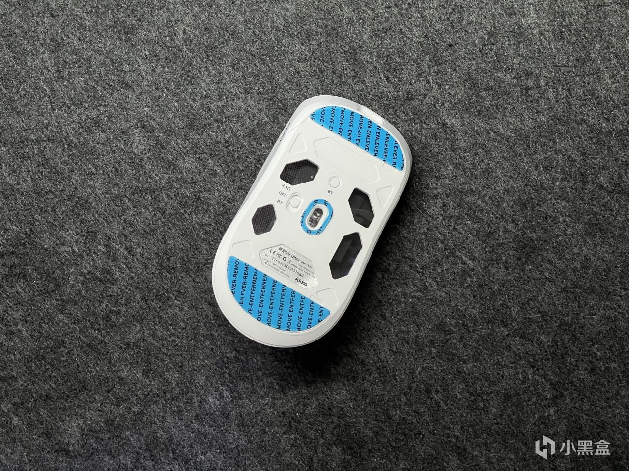 翻到背面,一开始我还在想灵动V9Ultra都没打孔,39g的重量是怎么控制出来的,一看到背面就恍然大悟了,原来打孔在这儿呢,算是Akko在重量和握持手感上所作的一个妥协。