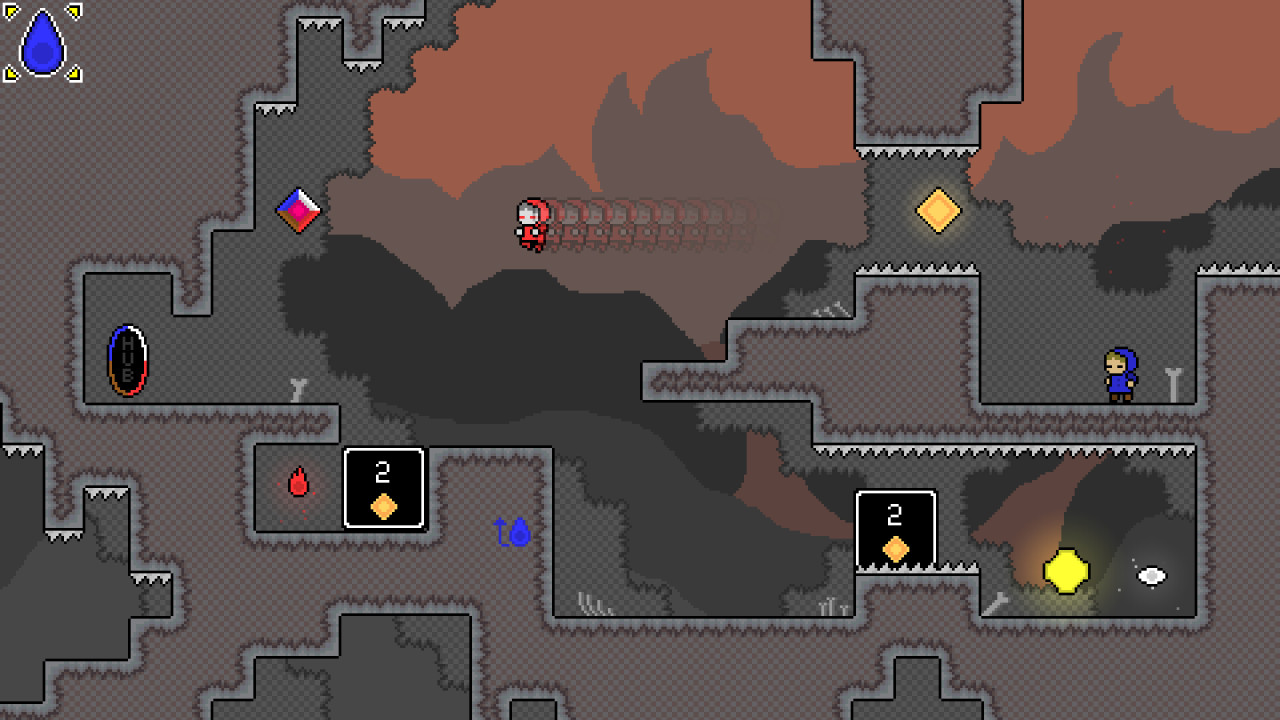 本作的核心機制是比較簡單的:關卡中有各種各樣的“元素寶石”,這些寶石屬於一次性使用的道具,主角可以通過拾取並使用這些寶石來用出一些特殊的技能,一般是位移能力,比如水元素石可以讓主角向上“二段跳”一次,而空元素石可以讓主角橫向“衝刺”一段距離,等等。
