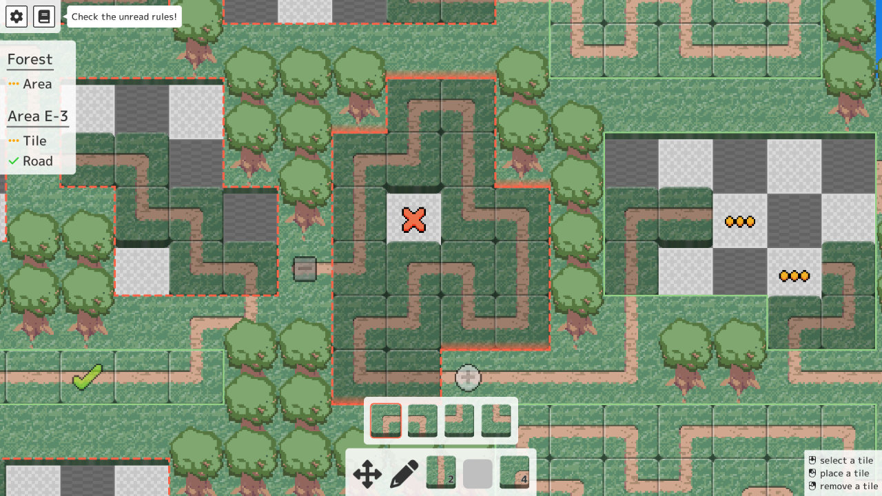 在本作中,玩家需要用“拼圖塊”去拼路徑等各種各樣的形狀,而這些形狀也需要滿足其它條件,比如連通性等等。雖然玩家也可以靠直覺解謎,但作者更推薦的方式是用嚴謹的邏輯推理得到答案,這也是爲什麼把本作放到“紙筆解謎”這一類。