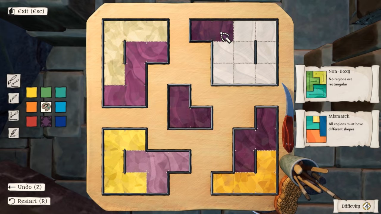 在區域分割謎題中,只有分割出來的形狀是在邏輯上有意義的,而大家在宣傳片和截圖裏看到的各種顏色其實都只是裝飾,玩家可以自己隨意替換,不過就算你沒有那個耐心,我感覺默認填色也挺漂亮的。對比“黑白填格”,那個對應的是一整類被稱爲“Shading”(塗黑)的紙筆謎題,而“區域分割”也當然早有很多現成的紙筆謎題題種可供參考。商店頁說有超過20種規則,而剩下的就是發揮“模塊化”的傳統藝能,將這些不同的規則拆分重組,由此產生更多值得探索的組合。《真知之島》就是這一點讓我特別喜歡,所以很高興這一點獲得了傳承。如果本作收穫好的話,說不定可以看到其它題種(比如路徑),或者更加有野心的組合。