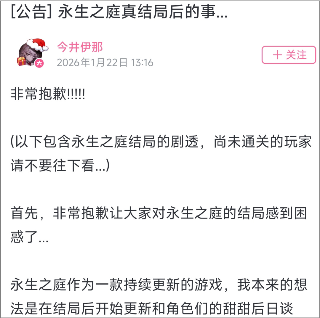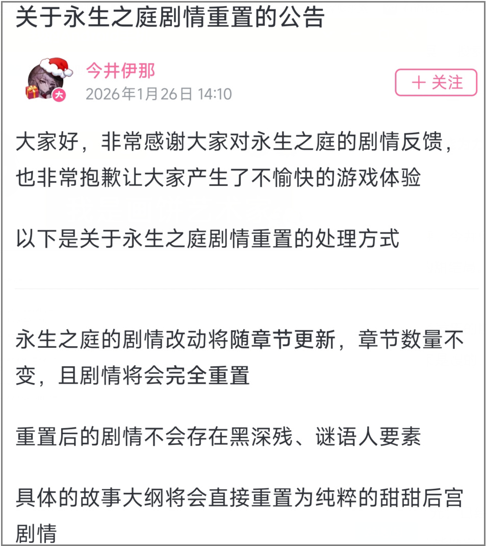 第二个节点,是剧情方向的认错。面对欺诈差评,今井伊那发公告承认剧情方向出了问题,宣布将重置游戏剧情,改回玩家期待的甜结局。