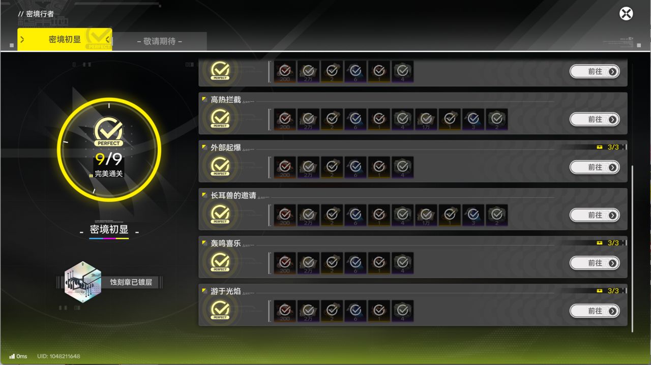 目前新活动【密境行者】已开启全部关卡 全关卡奖励合计1800嵌晶玉=3.6抽