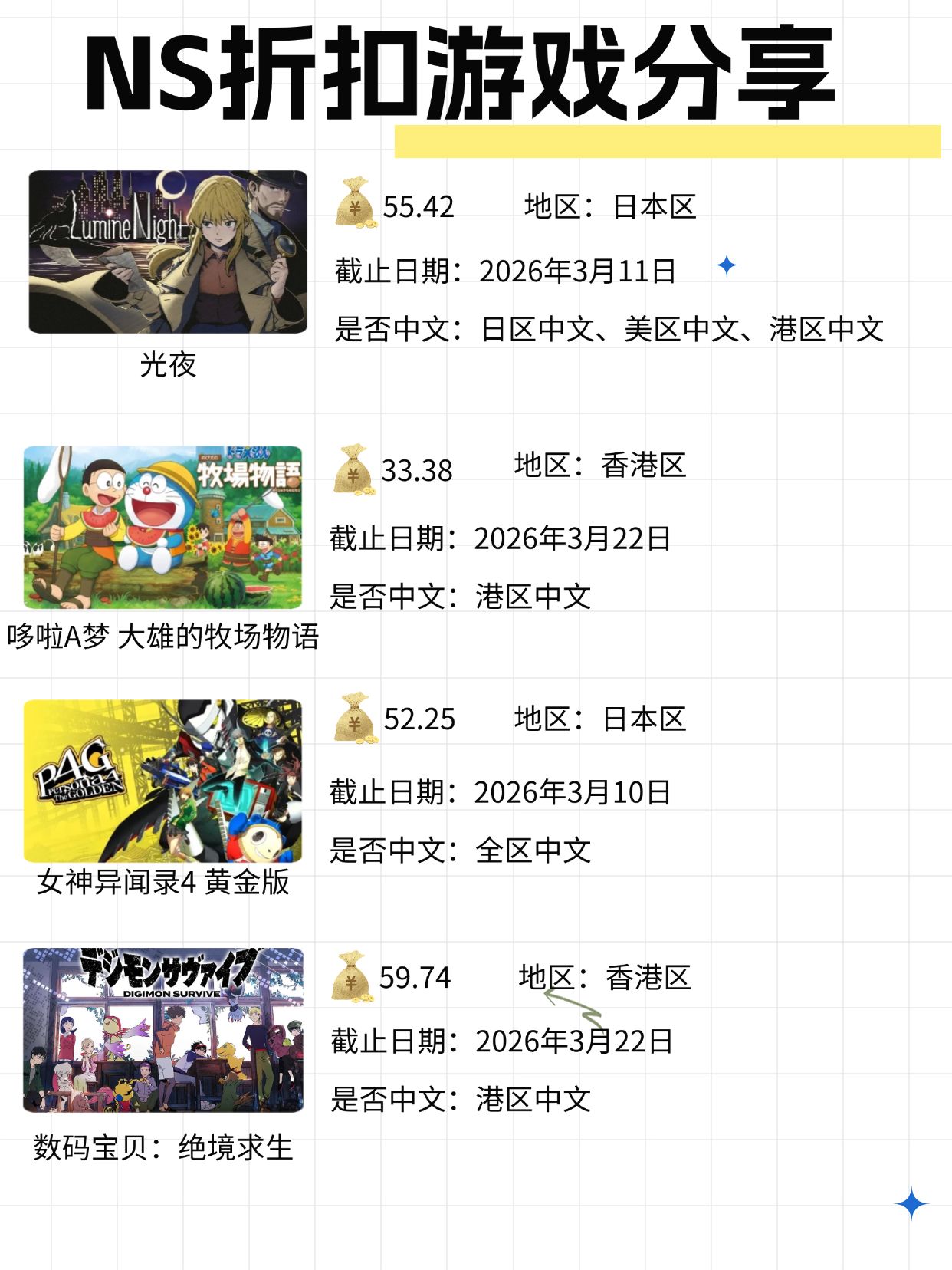 本周漫粉福利周,间谍过家家史低两位数,数码宝贝绝境求生也迎来50+左右的价格, 哆啦A梦:大雄的牧场物语依旧是30多的价格,可以入手