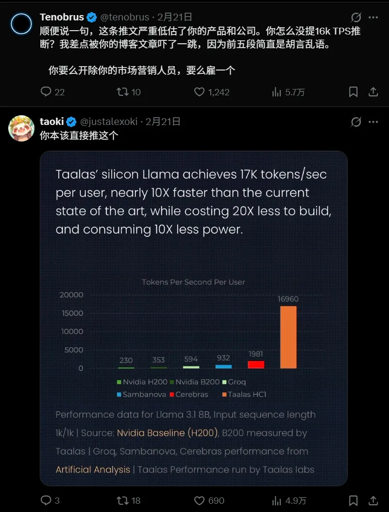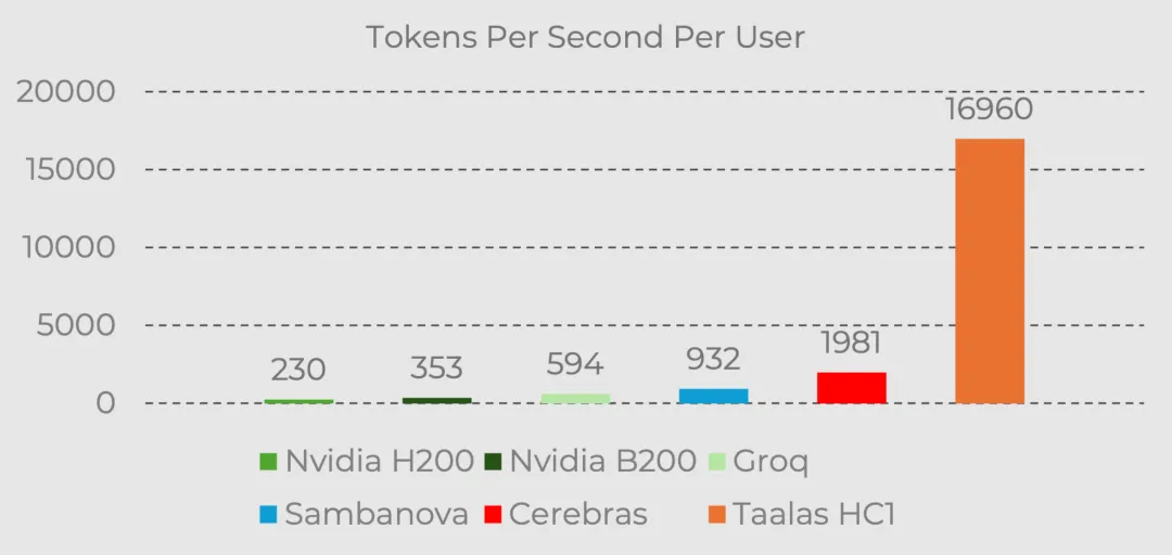 Taalas 的 HC1 是 Cerebras 的将近十倍,是 B200 的快五十倍,其官方给出的实测 demo 里跑出过 16960 tokens/s,一整条回复 0.138 秒就吐完了。