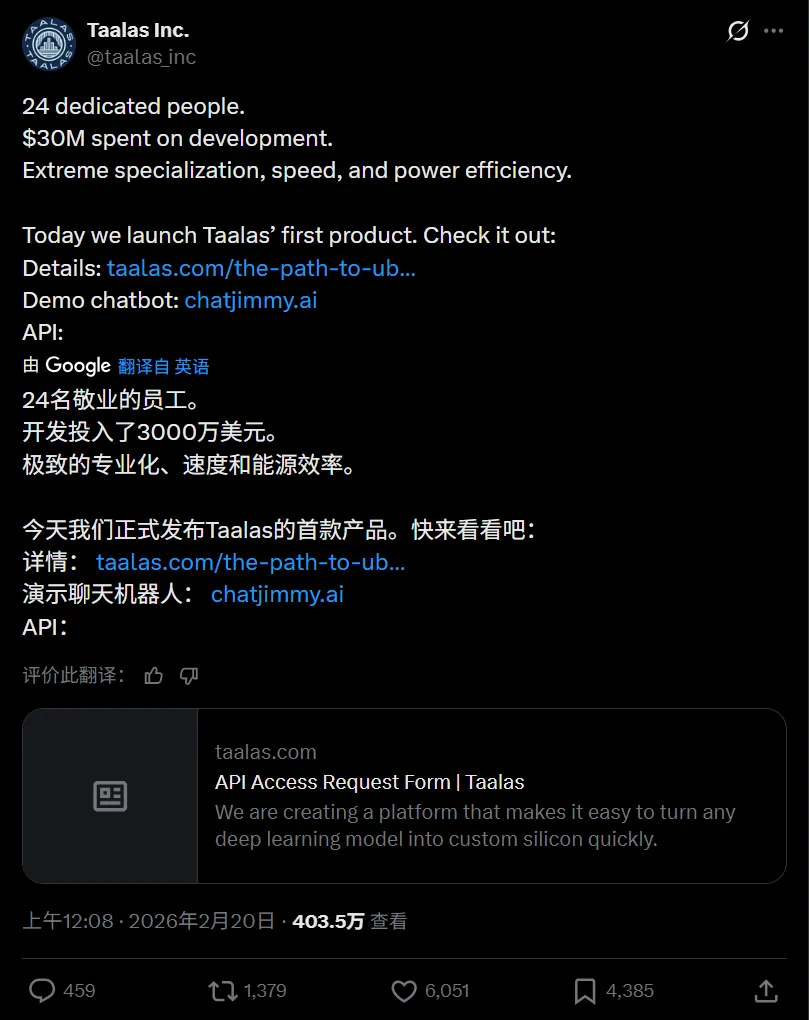 上周,一家叫 Taalas 的加拿大公司从隐身模式里钻了出来,带着一块芯片和一句 slogan: