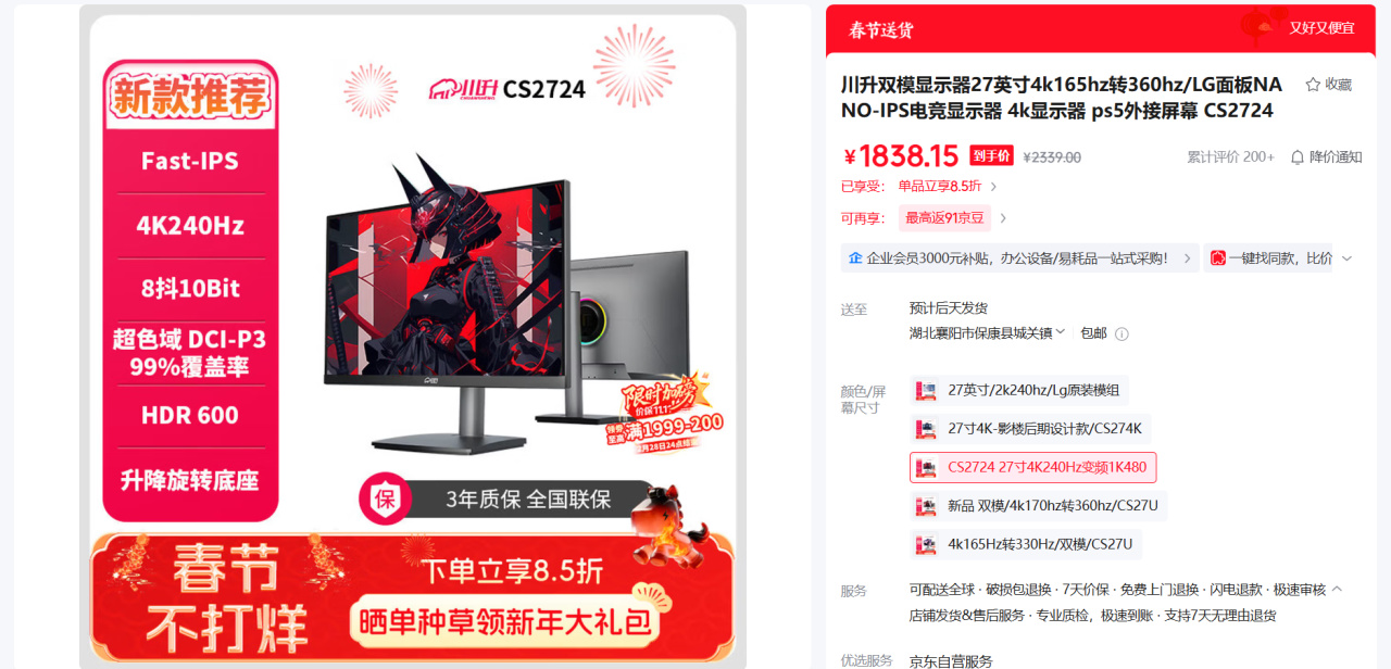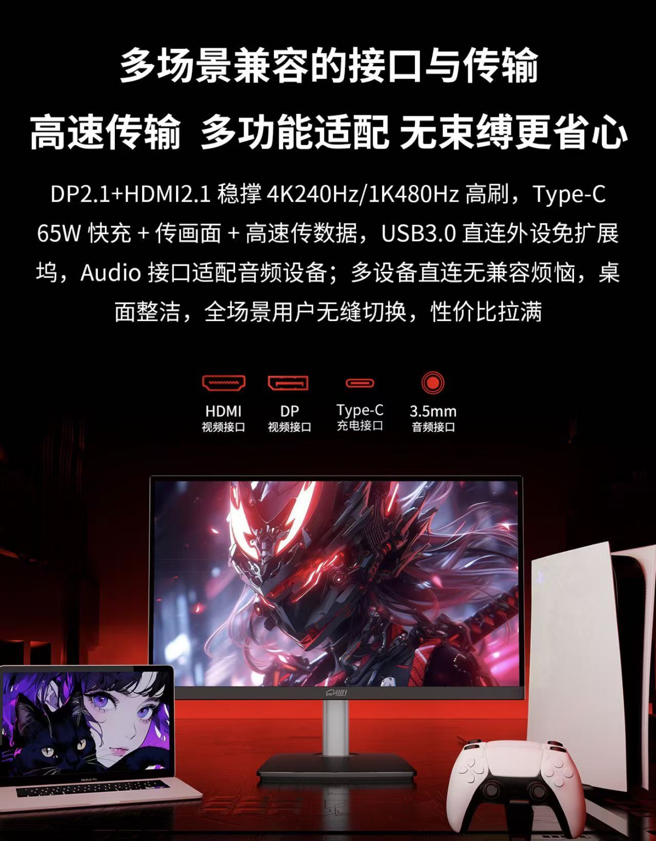 类似就是川升CS2724,4K 240Hz/1080P 480Hz。4K 240Hz拿来办公非常方便,清晰度足够,看着舒服;1080P 480Hz打竞技游戏也完全够用,极其流畅。
