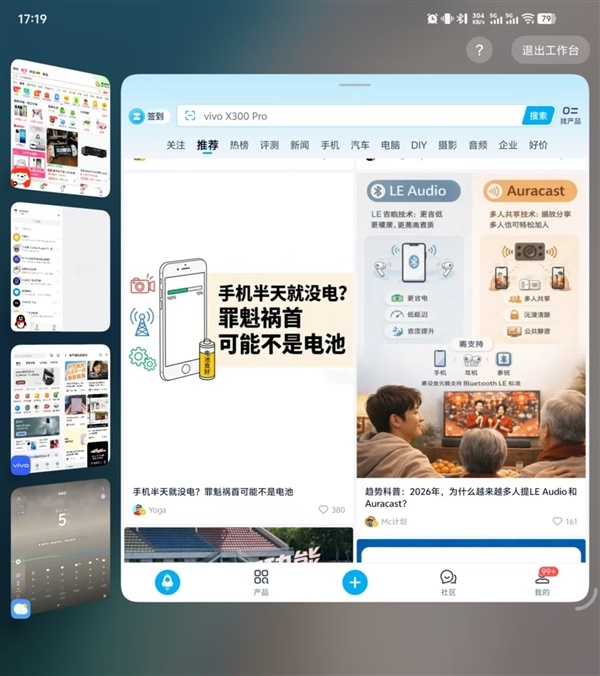 但只有这些显然还不够,基于折叠屏的优化,恰恰可以搬到巨屏手机上来。比如应用界面显示不是单纯的放大,而是内容的重新排列;大尺寸屏幕的多任务操作不再是传统的进入后台翻找,而是重新设计的快切工作台让操作更便利。