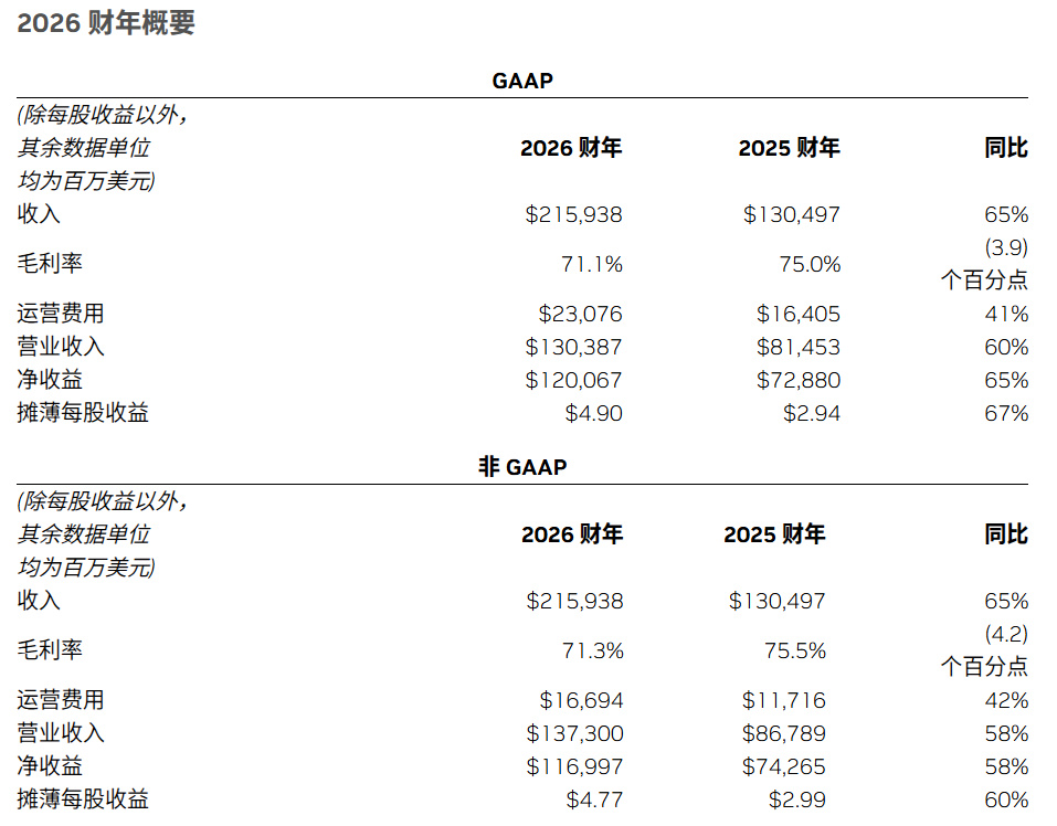 全年收入创下 2,159 亿美元纪录,同比增长 65%,毛利率71.1%,同步上涨3.9个百分点,净利润1,200.67 亿美元,同步上涨65%。