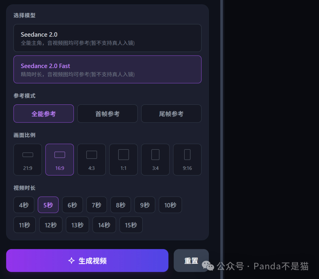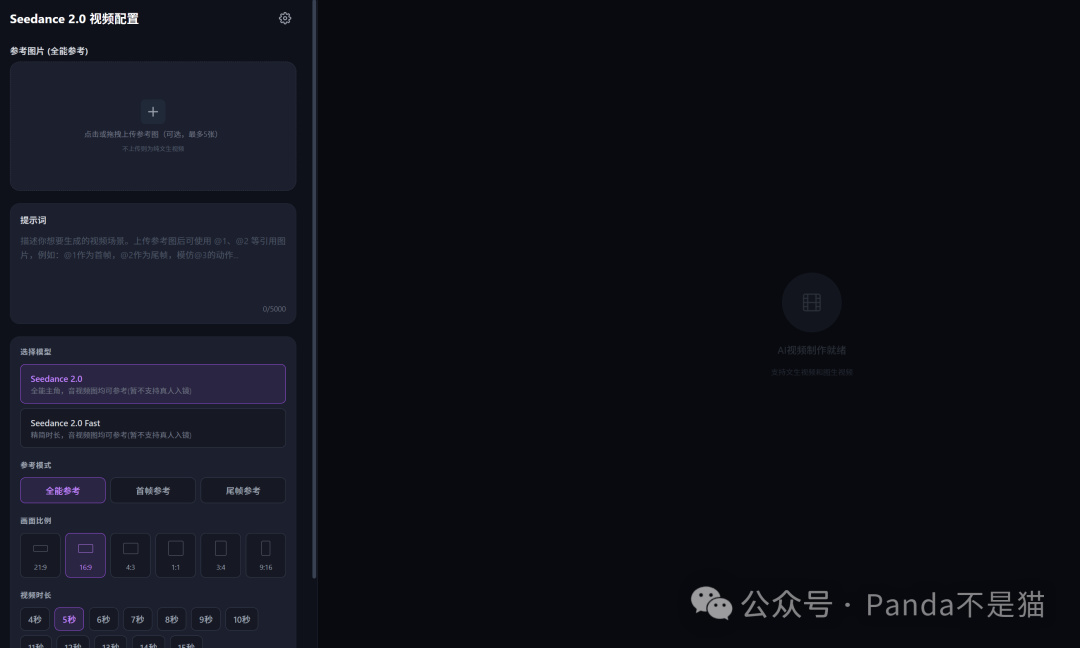 再往下可以设置模型,前面也提到了,目前两种Seedance都支持,同时在下方则是参考模式以及生成的画面比例和时间的调整。目前Seedance的费用并不低,5秒的视频大概积分是20左右,换算成正常的月卡会员差不多3-5元。