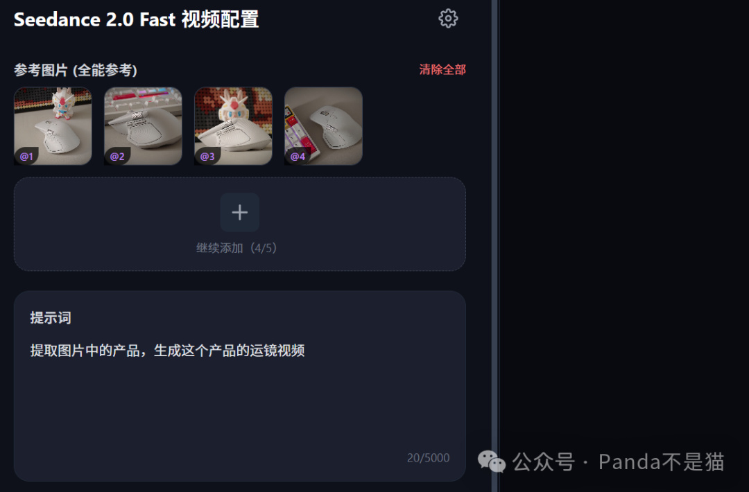 和官方一样,该项目下也支持插入参考图、提示词以及设置参考模式,参考图方面最多支持五张参考图,上传的首张则为首帧,最后一张则称之为尾帧。