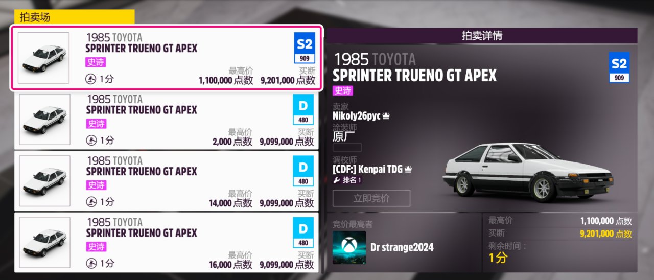 奖励车辆为:1985款TOYOTA SPRINTER TRUENO GT APEX(拍卖场价格要大跳水了)