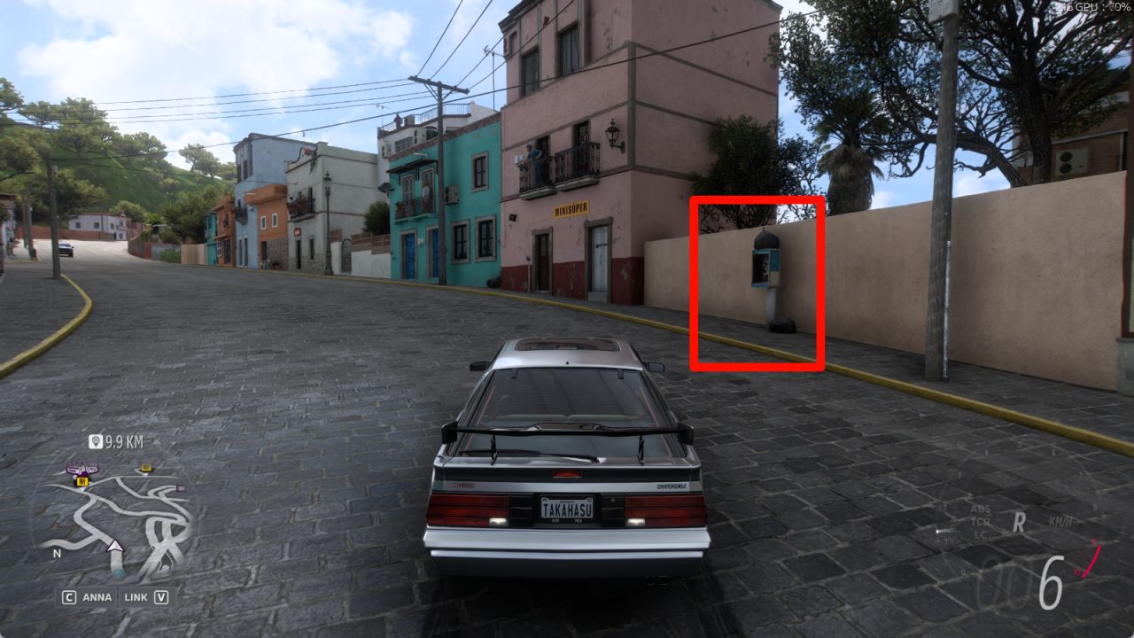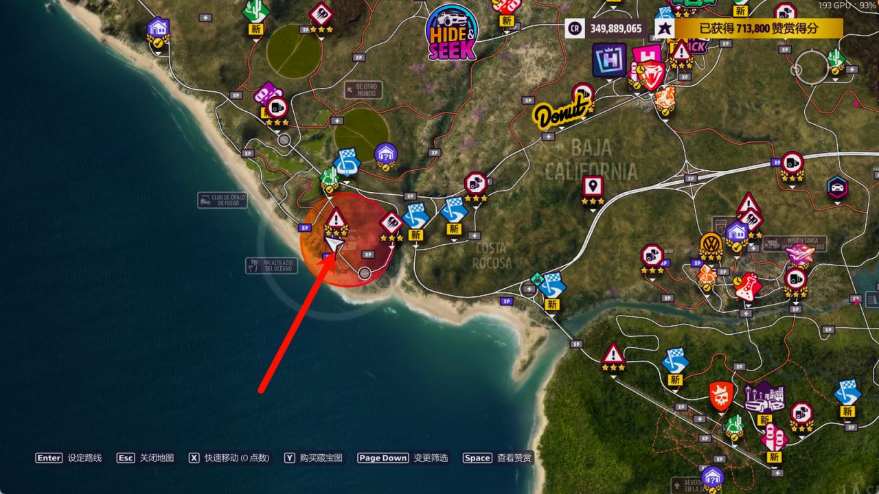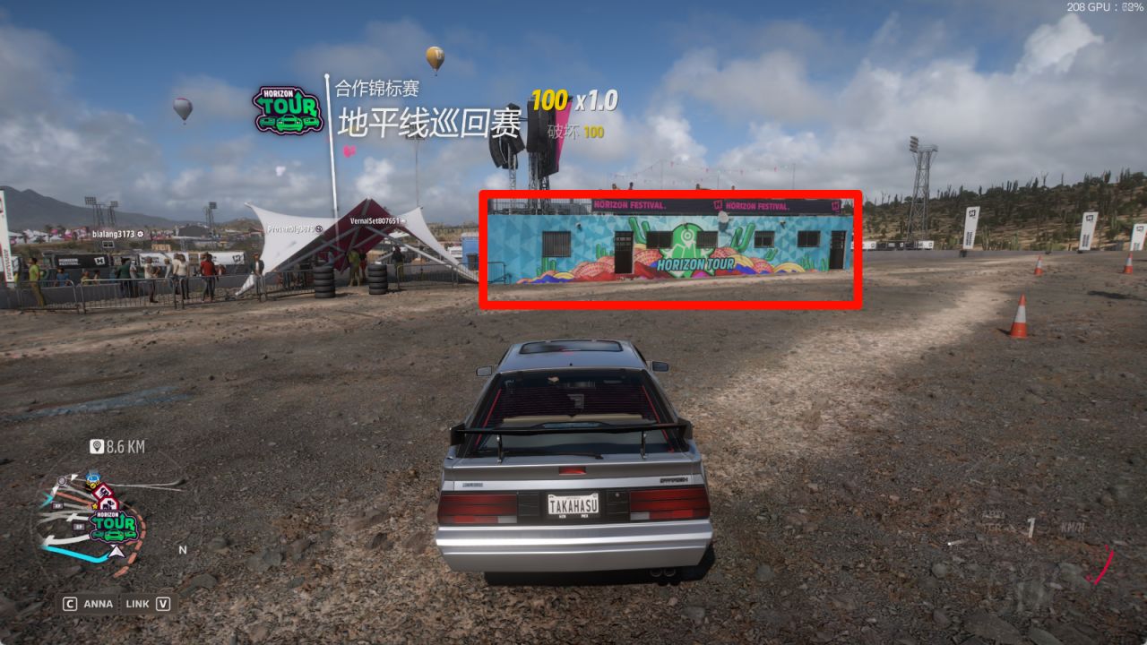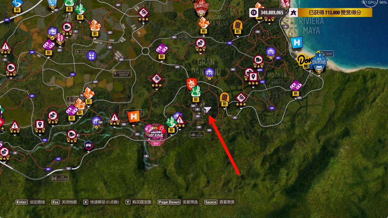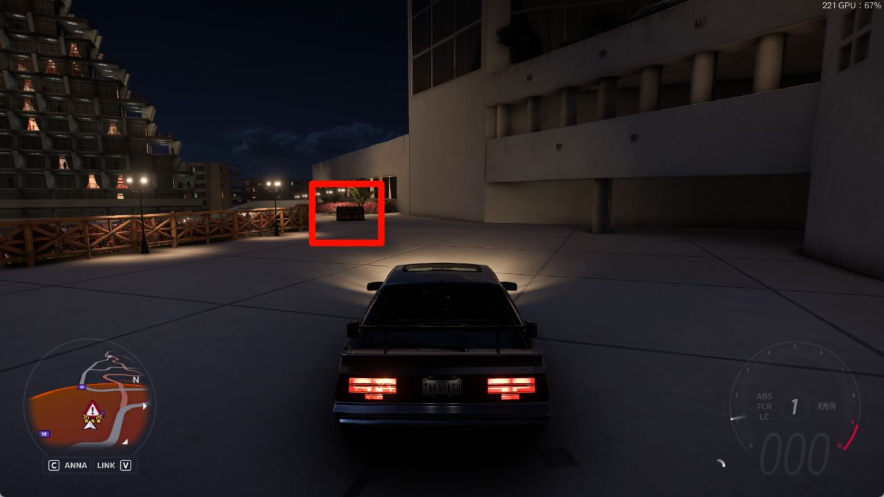 驾驶1988款三菱 Starion ESI-R(车展)连续使出3次终极险象环生技术(高速上对向开车),即可触发宝箱大致范围,位置如图(从斜坡下去),完成奖励为300马拉松点数