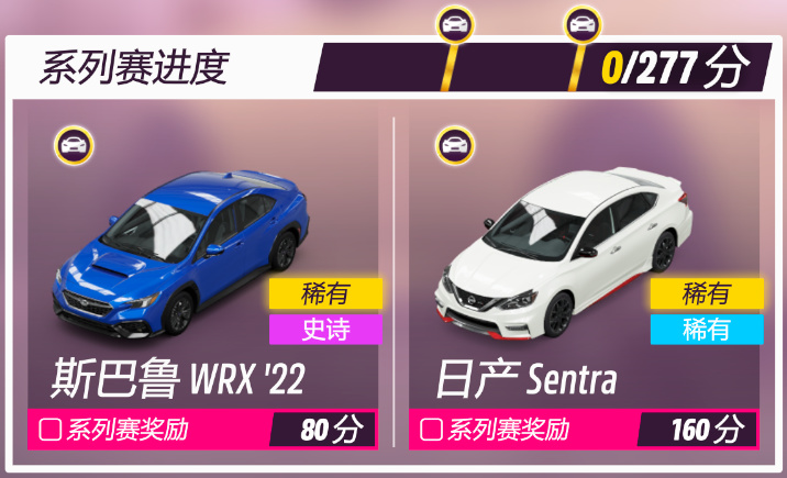 S57赛季系列赛80分进度奖励为2022款斯巴鲁 WRX和160分进度奖励为2018款日产 Sentra Nismo