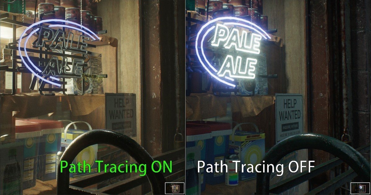 你可以将光线追踪理解成一道光柱照亮物体以及产生的二级反射,除此之外的衍射、散射微弱光线未必会在游戏中得以体现。但路径追踪就像在在房间里释放无数萤火虫。它们四处随机反弹,最终记录下所有直接光、间接光、颜色混合,这也是《生化危机:安魂曲》将沉浸恐怖感拉满的重要原因。