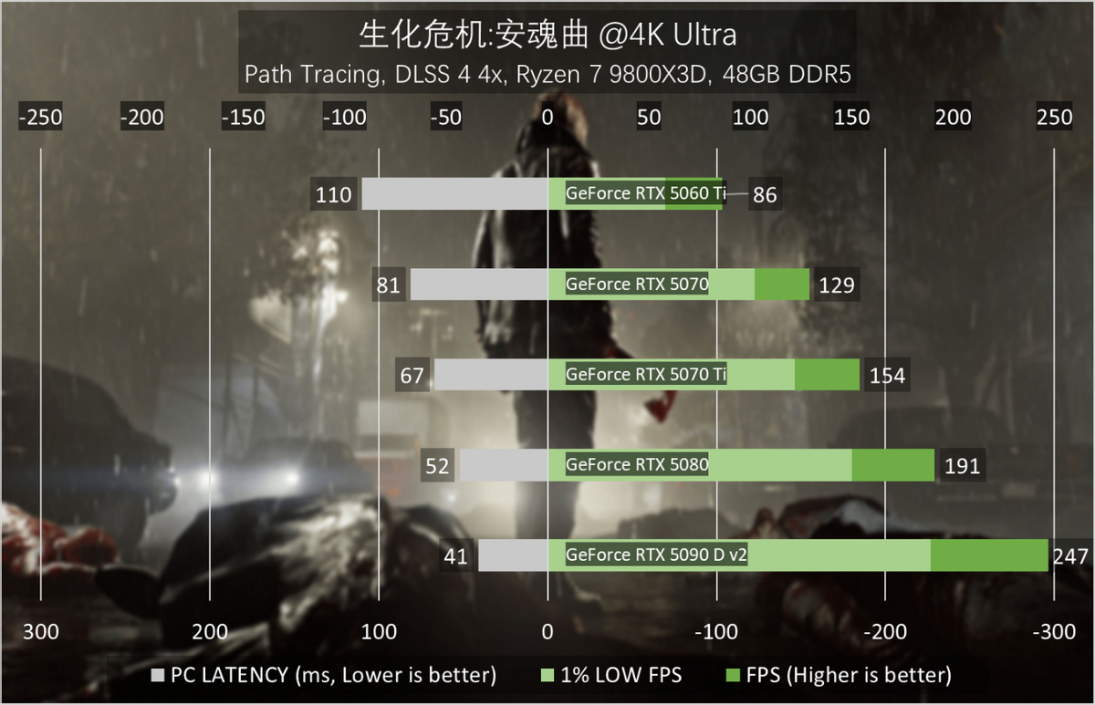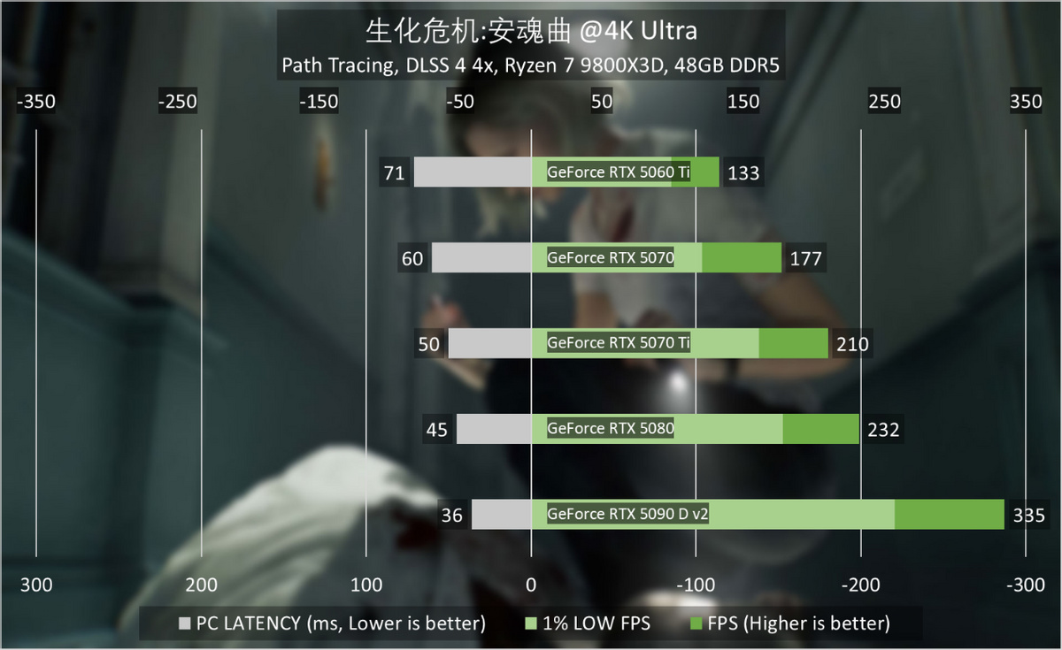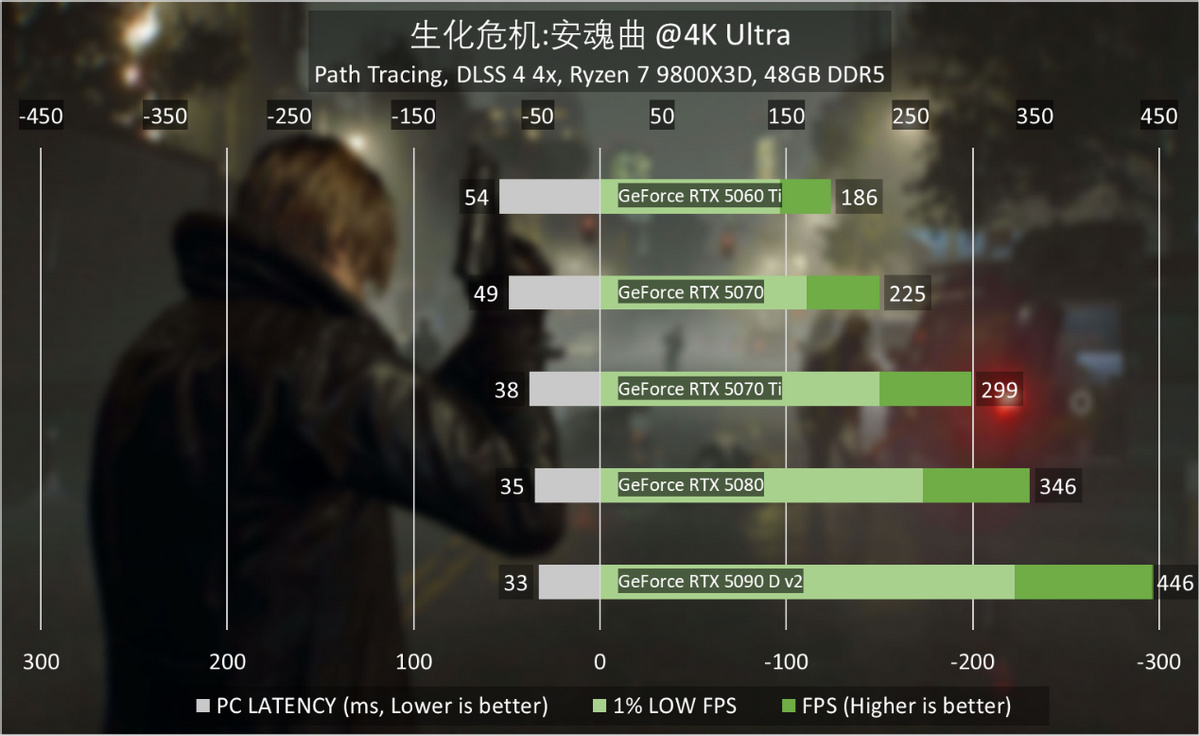 1080p分辨率最高画质同样如此,GeForce RTX 5070就能够轻松在开启路径追踪和最高画质的前提下,将游戏帧率保持在200FPS以上。GeForce RTX 5070 Ti则足以支撑《生化危机:安魂曲》跑到300FPS大关,GeForce RTX 5090 D v2更是可以接近450FPS,配合只有33ms的系统延迟,体验相当丝滑。