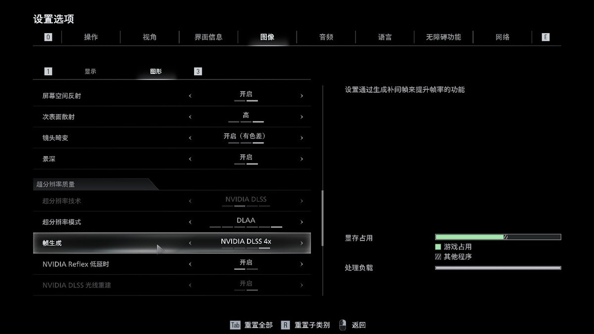 开启DLSS 4 4x多帧生成后,用AI提升帧率的同时,降低系统延迟也变得很有必要。NVIDIA Reflex在设置中也会同步开启,并支持随时调整。这一项同步CPU和GPU渲染流程来降低系统延迟的技术,确保AI提升帧率之后,玩家的关键操作可以快速得到CPU和GPU响应,并最终展现在屏幕上,无论《生化危机:安魂曲》这样的3A级游戏,还是《无畏契约》这样的竞技游戏都非常有用。