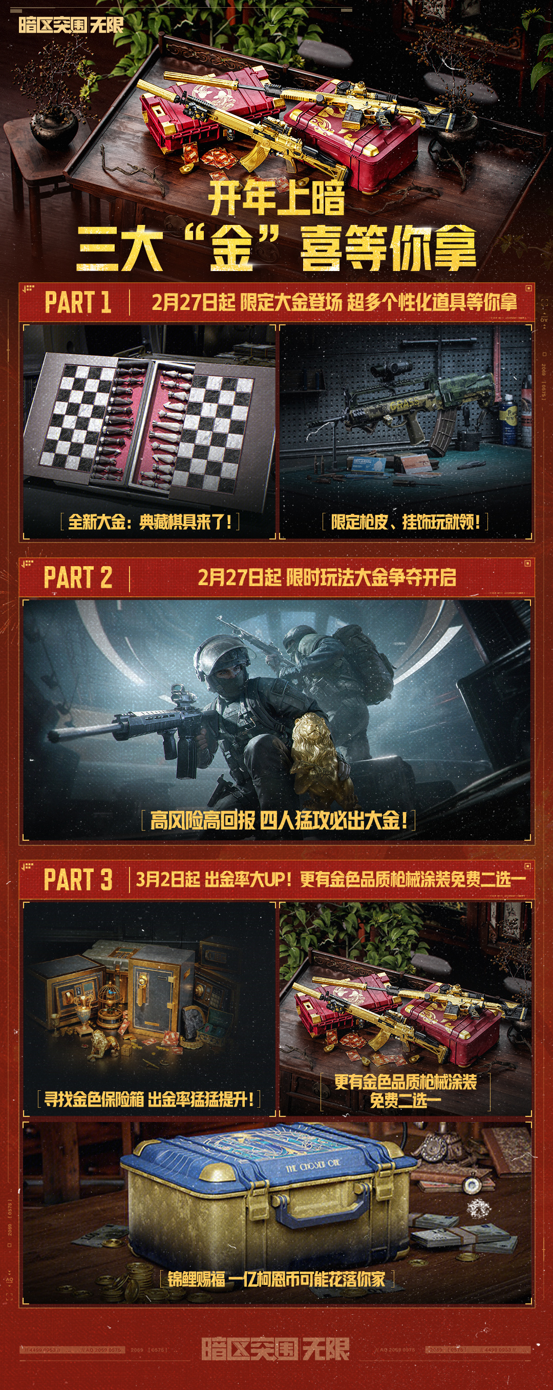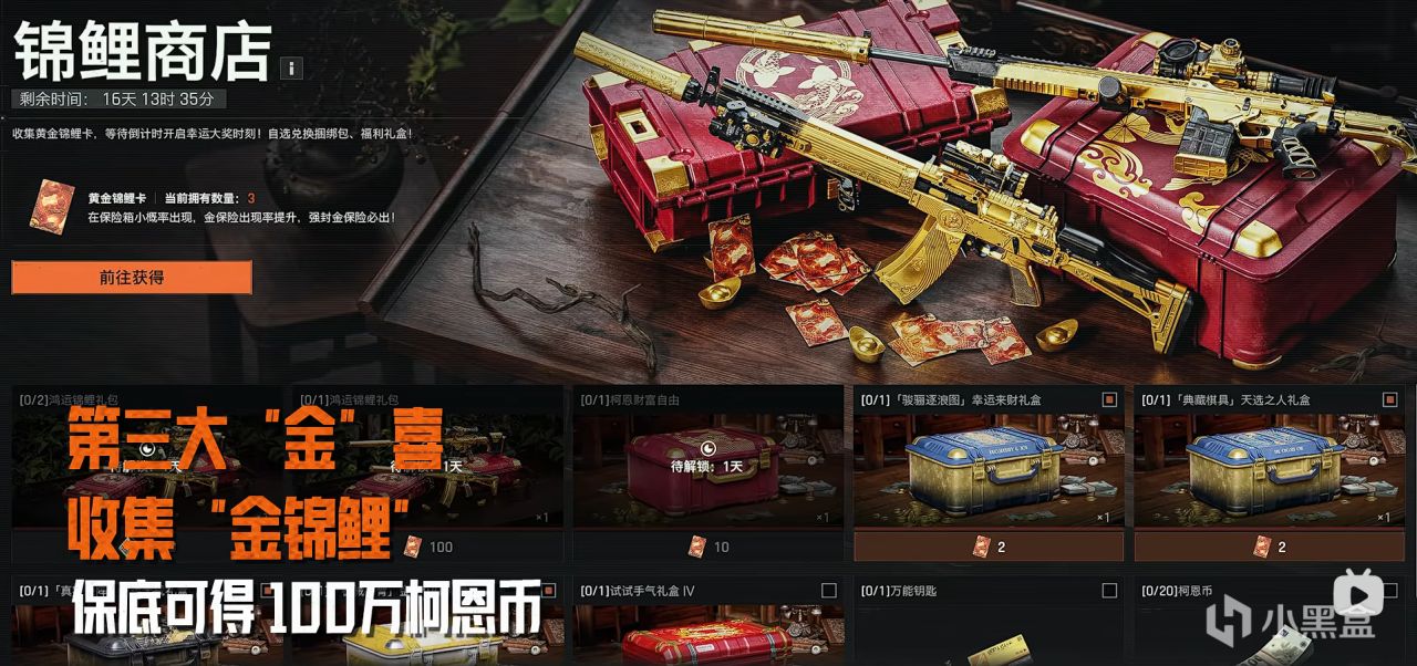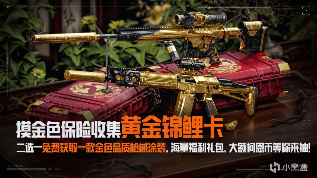 活动期间搜索各类型保险箱,将有概率获得黄金锦鲤卡,收集黄金锦鲤卡,等待锦鲤商店倒计时开启幸运大奖时刻,即可二选一免费获取一款金色品质枪械涂装,更有海量福利礼包、大额柯恩币等你来抽!