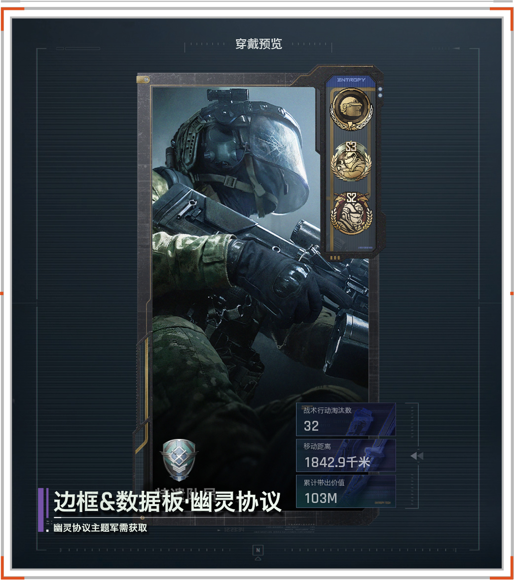 活动期间,消耗「幽灵军需卡」即可参与「幽灵协议」主题军需活动,每次参与都能获得奖励,更有机会获得近战武器「幽灵协议·弹簧刀」,以及手套「神经漫游者」。
