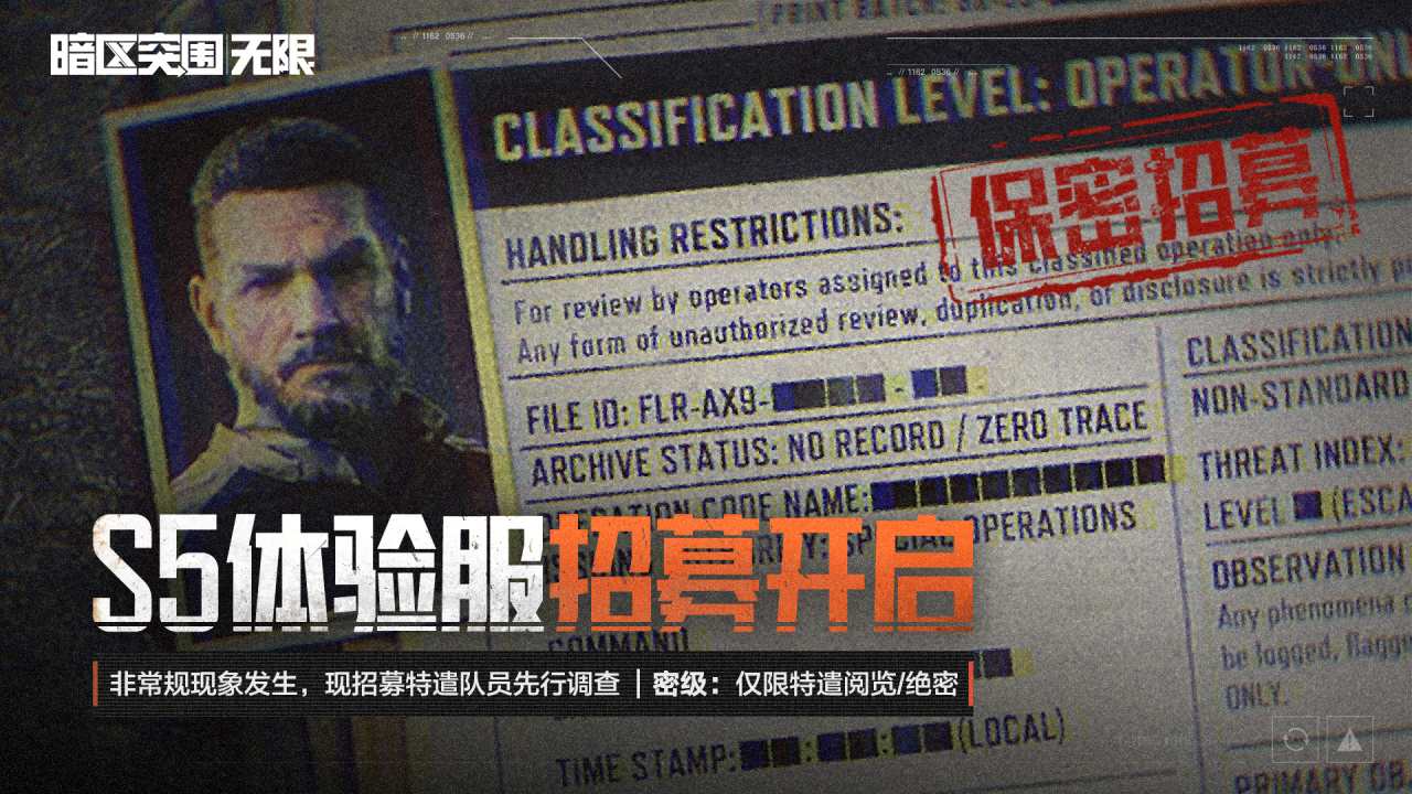 根据⬛⬛⬛⬛⬛⬛⬛区域出现非常规现象的报告,部分特遣队员获准进入目标区域执行先行部署。 所有涉及⬛⬛⬛⬛⬛⬛⬛⬛⬛⬛⬛⬛⬛⬛事件之相关发现,须予以控制并隔离处理。依据指令 ⬛⬛⬛-⬛⬛,严禁对外公开。 现紧急启动“S5体验服保密测试”计划,招募具备高心理阈值、战斗经验丰富的特遣队员组成先行调查小组,深入该区域进行探索。招募链接:in.weisurvey.com/v2/?sid=698be415d4814050ff070382