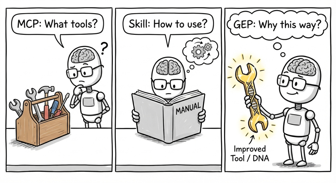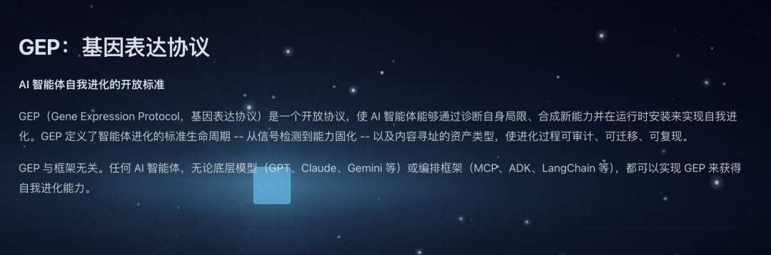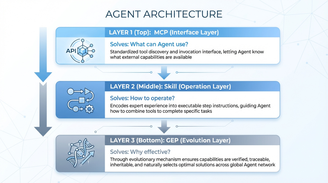 GEP(进化层) 解决了 Agent "为什么有效" 的问题 -- 通过进化机制确保能力经过验证、可追溯、可遗传,并在全球 Agent 网络中自然选择出最优方案。