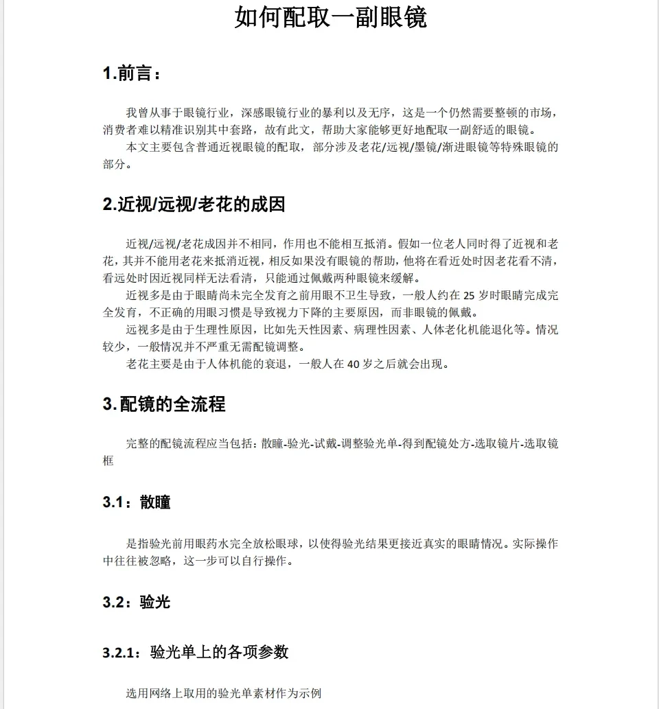 本文主要包含普通近视眼镜的配取,部分涉及老花/远视/墨镜/渐进眼镜等特殊眼镜的部分。