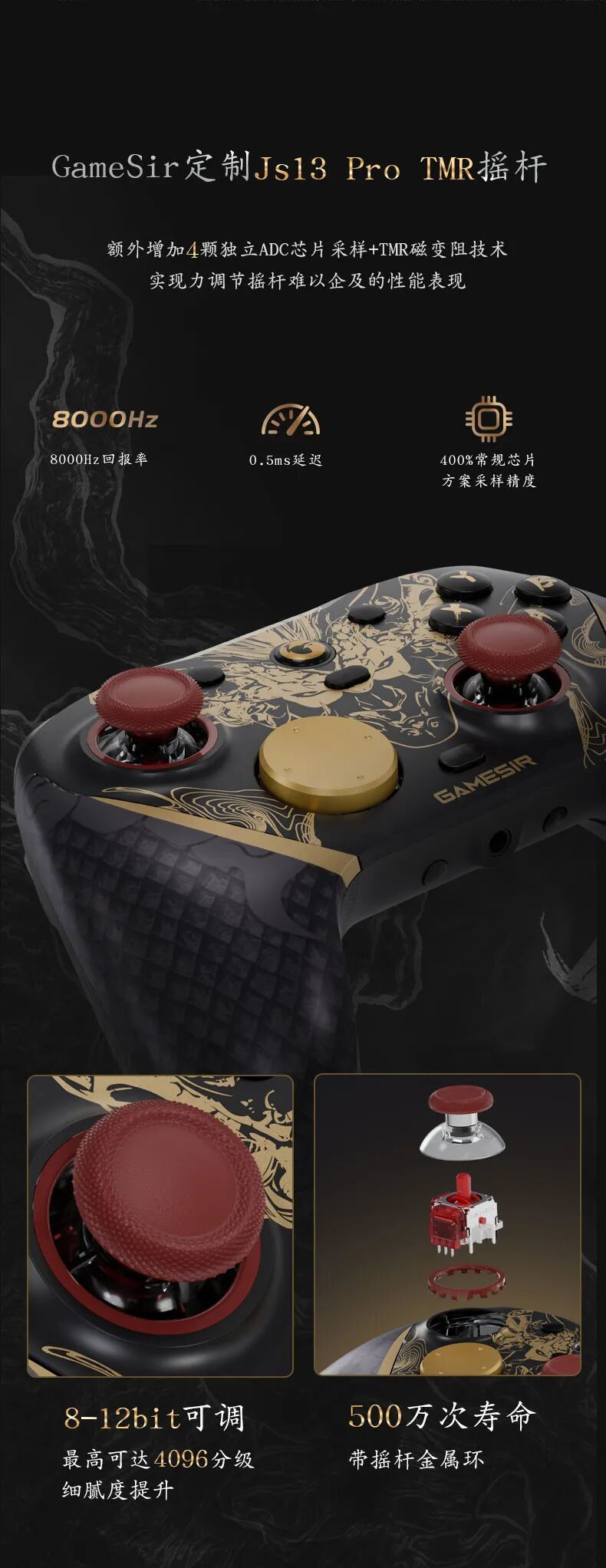 定制款Js13 Pro TMR摇杆,额外搭载4颗独立ADC芯片采样,并融入TMR磁变阻技术,达到400%常规芯片方案采样精度,更实现了8-12bit可调、最高4096级的精细分辨率。