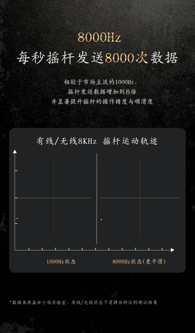 8000Hz高回报率,每秒摇杆发送8000次数据,显著提升摇杆的操作精度与顺滑度。