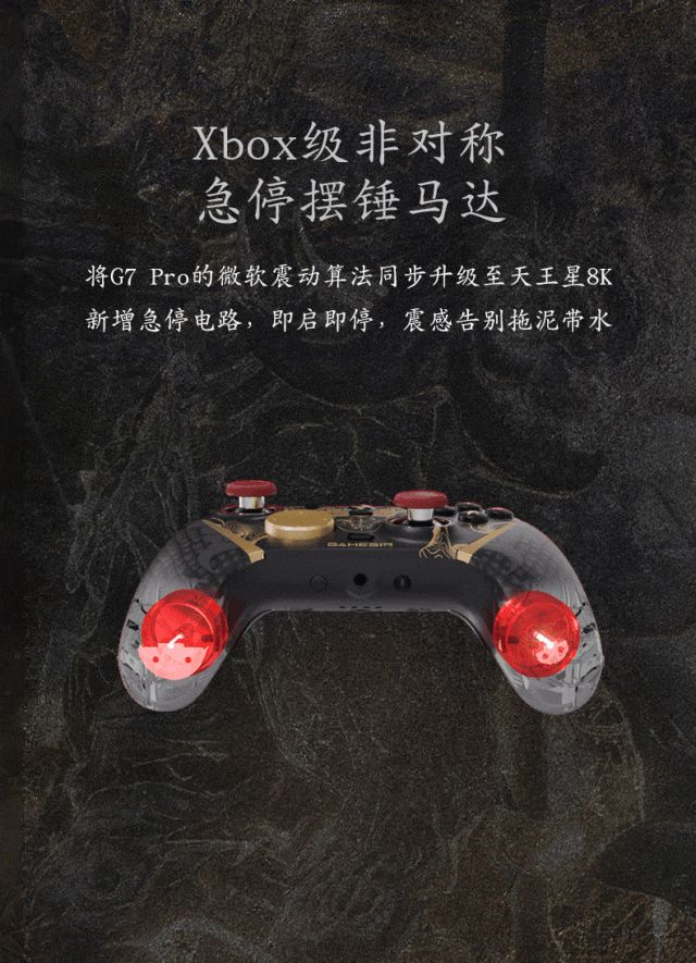 在沉浸式战斗体验方面,继承G7 Pro的微软震动算法的Xbox级非对称急停摆锤马达,新增急停电路,震感即启即停,干脆利落,沉浸感更强。