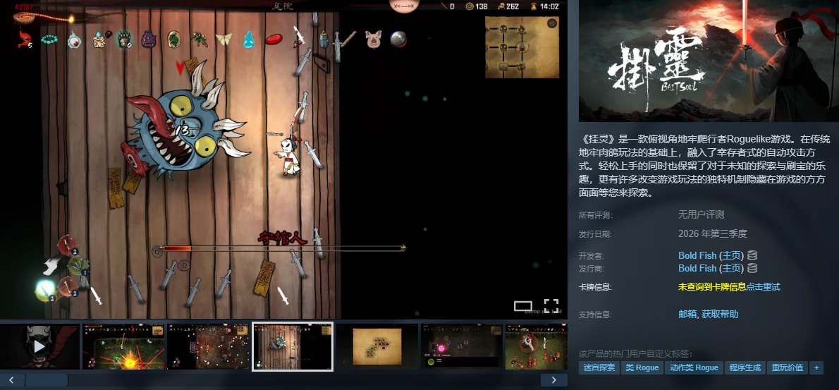 《掛靈》是一款國風暗黑肉鴿地牢遊戲,玩家操控"掛靈"組合元素武器與道具在隨機地牢中戰鬥,敵人和地圖完全隨機。特色靈魂球系統可裝備火焰閃電等元素,道具組合策略豐富,含穿透彈頭、吸血透鏡等搭配。