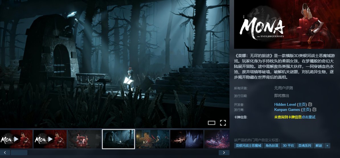 《莫娜:無盡的旅途》是由隱藏關工作室開發的橫版3D類銀河戰士惡魔城遊戲,融合黑暗童話、惡魔城與類魂元素。玩家扮演手持枕頭的少女莫娜,在夢魘般的奇幻大陸冒險,通過雙角色切換、自由徽章組合及高強度BOSS戰,探索廢棄塔鎮等祕境並揭開世界真相。