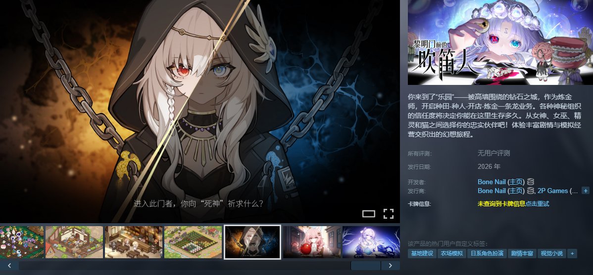 《黎明門前的吹笛人》是骨釘工作室開發的懸疑經營RPG,玩家經營鍊金工坊並探索鑽石之城的陰謀,融合種植、自動化生產與多勢力互動,含克蘇魯元素及多結局分支。