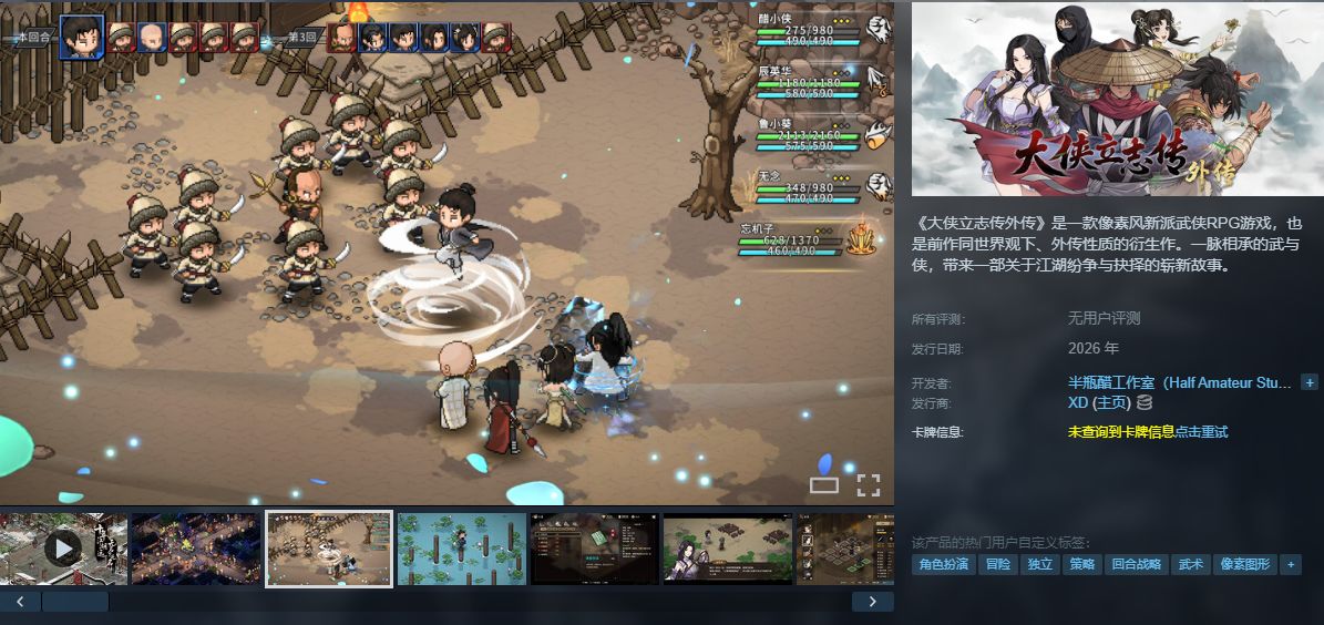 《大俠立志傳外傳》是半瓶醋工作室開發的像素風武俠RPG,爲前作同世界觀衍生作,背景設定在新朝初立的江湖動盪時期。玩家扮演富家少年闖蕩江湖,通過選擇驅動多分支劇情,結局高度自由。遊戲新增八方向移動、角色捏臉及跳躍功能,戰鬥迴歸回合制並加入“鬥志連攻”“弱點破防”“夥伴合擊”等策略機制。