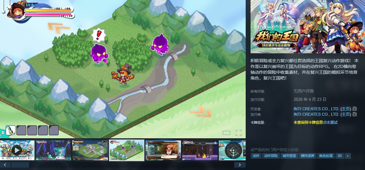 《我們的王國 蝕時果實與遠古魔物》是Inti Creates開發的混合2D動作與模擬經營RPG,玩家需復興崩壞的亞露瑪西雅王國,通過橫向卷軸戰鬥收集素材,並在模擬環節建造設施、培育角色。遊戲提供皇家騎士、巫師等4種初始職業,支持自由切換與多路線發展,王城類型選擇將影響城鎮建設方向。