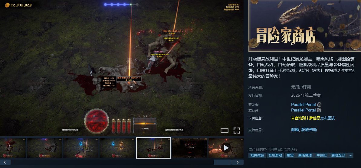 《冒險家商店》是Parallel Portal開發的暗黑風掛機刷寶+店鋪經營遊戲,玩家扮演中世紀NPC店主,通過自動戰鬥與拾取系統刷取隨機詞綴裝備,再開店販賣獲利,實現“打怪-賣貨”雙循環。核心特色包括全自動化掛機(離線持續收益)、無限冒險等級成長及符文自由搭配流派。