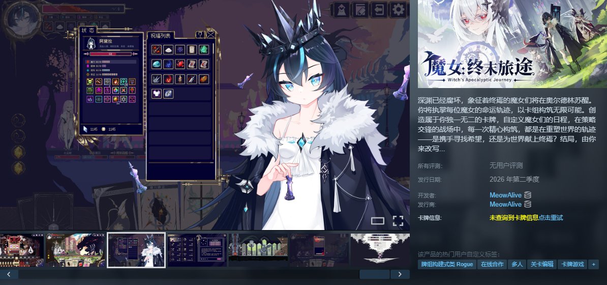 《魔女:終末旅途》是一款多人聯機卡牌肉鴿遊戲,支持最多4人合作,玩家引導魔女小隊在末日世界中通過卡牌構築、命運編排與鍊金附魔對抗強敵。核心特色包括自由組合魔法效果的“空白卡牌”系統、自定義每日遭遇的“命運牌”時間軸,以及卡牌/遺物/祝福三維流派構築。