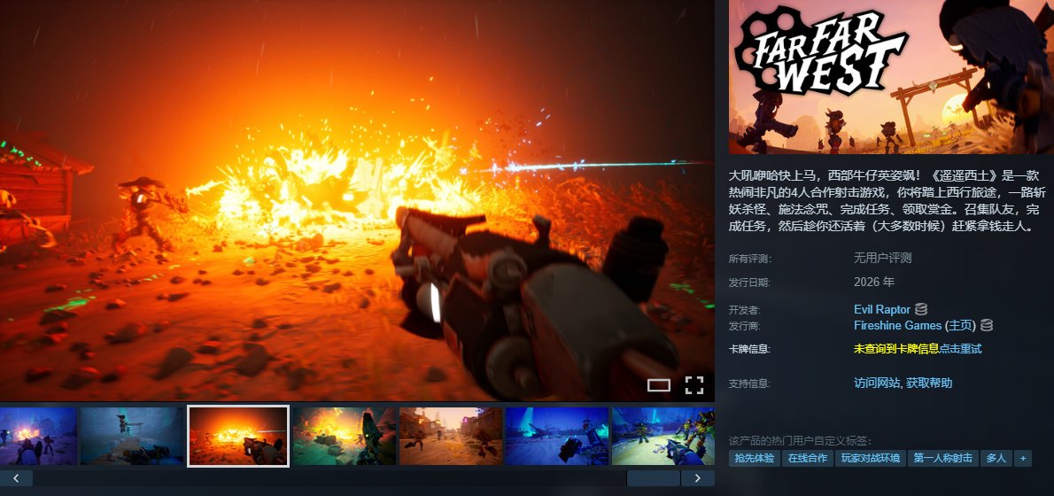《Far Far West》是Evil Raptor工作室開發的魔幻西部主題PvE撤離射擊遊戲,玩家扮演機器人牛仔,在荒野中狩獵骷髏生物並完成懸賞任務,支持4人合作與元素魔法組合系統。遊戲融合復古未來主義風格與肉鴿機制,含武器升級、技能定製及坐騎外觀解鎖。