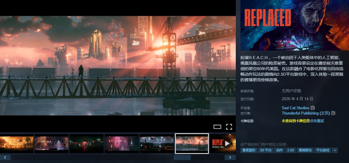《REPLACED》是由白俄羅斯工作室Sad Cat Studios開發的2.5D科幻復古未來主義動作平臺遊戲,玩家扮演被困在人類身體內的人工智能R.E.A.C.H.,在另一個1980年代的反烏托邦世界“鳳凰城”中展開冒險。遊戲融合手繪像素藝術與現代光影特效,採用自由流動式格鬥系統,結合平臺跳躍、解謎與電影化敘事,探討AI與人性主題。