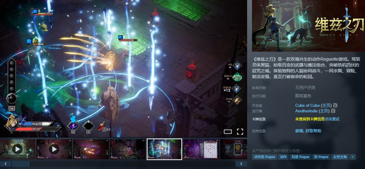 《維茲之刃》是一款俯視角動作肉鴿遊戲,玩家扮演被詛咒的女騎士“塞拉”,與神祕黑貓靈體協同作戰,通過組合武器、元素祝福與紋章系統,在隨機生成的詛咒之城中冒險。遊戲主打人貓雙魂共生機制,黑貓可釋放聚怪、高傷等技能,戰鬥對標《哈迪斯》的流暢手感,含108種祝福、50+紋章及20+武器自由構築流派。
