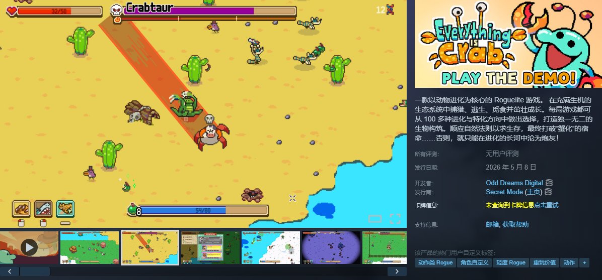 《萬物皆可蟹:動物進化》是由Odd Dreams Digital開發、Secret Mode發行的動物進化主題Roguelite遊戲。玩家在動態生態系統中通過捕獵、吞噬或覓食獲取資源,從100多種進化選項自由組合生物形態,對抗“所有生物終將蟹化”的宿命。遊戲含四大生物羣系、晝夜循環及隨機Boss戰,支持探索/挑戰多難度模式,2D像素畫風實時呈現進化形態變化。