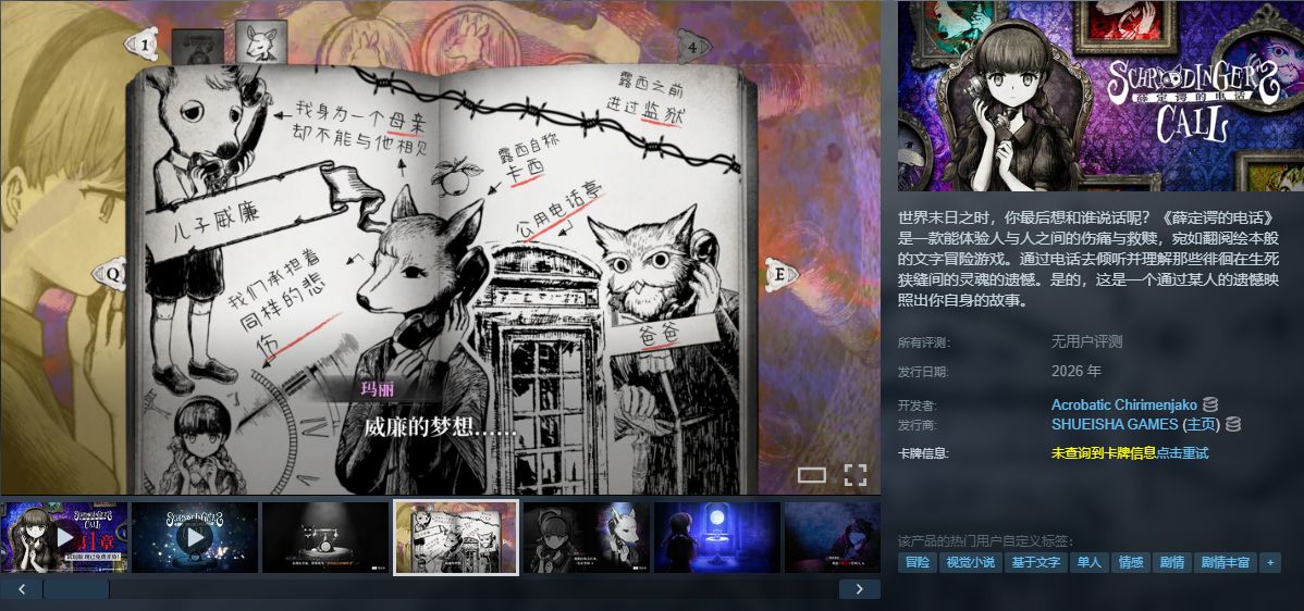 《薛定諤的電話》是一款繪本風文字冒險遊戲,玩家扮演失憶少女瑪麗,通過老式電話與生死夾縫中的靈魂對話,傾聽他們的遺憾並引導救贖。遊戲以量子力學“薛定諤狀態”爲隱喻,結合獨特的撥號操作與情感敘事,探討孤獨、存在與人際聯結。