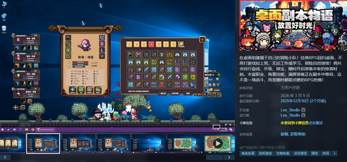 《桌面副本物語:放置好時光》是一款由Lee_Studio開發的輕量級放置類RPG遊戲,主打“自動冒險、隨時收菜”的休閒體驗。玩家可組建多職業小隊,通過全自動戰鬥在副本中刷裝備、升級角色,無需手動操作即可享受戰力成長的爽快感。遊戲融合像素畫風與自走棋式策略,支持自由搭配技能流派,並設有隨機裝備詞條與高階副本挑戰。